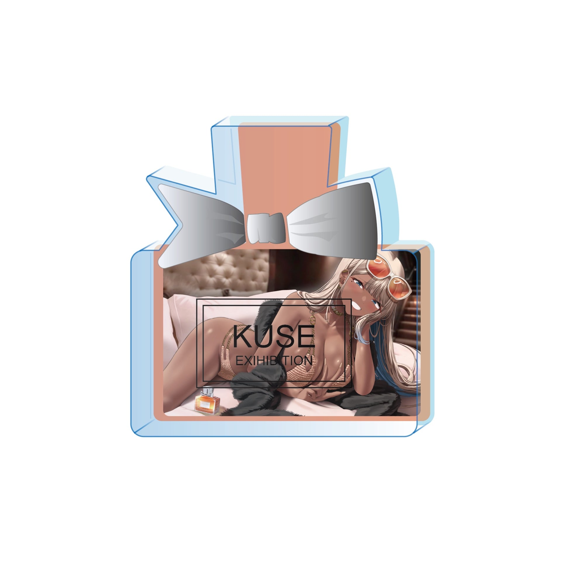 香水モチーフでダイカットされたアクリルブロックに作品がプリントされたオリジナルアイテム。